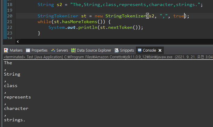 => 구분자를 기준으로 문자열을 분리하되 구분자를 토큰으로 넣는다면 true, 아니라면 false (기본은 false)