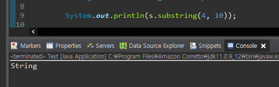 또한 start, end위치는 index값으로 구분하기 때문에 "T" = 0번부터 시작해서 "S" = 4번 ... "g" = 9번, " " = 10번이 되므로 String이 출력되는 것입니다.