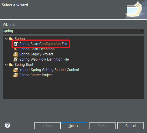 만들 때는 new-other에서 Spring Bean Configuration File로 만들어줍니다.