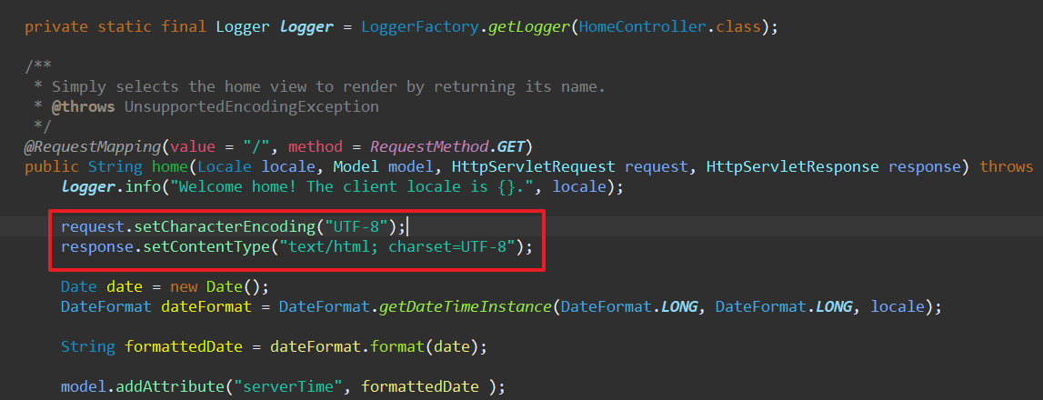 2. 아까 만들어졌던 com.mvc.hello 패키지의 HomeContoller.java에 역시 코드를 두줄 추가해주면 됩니다.